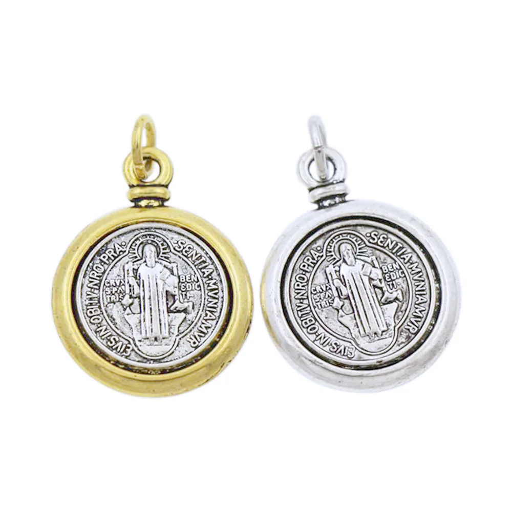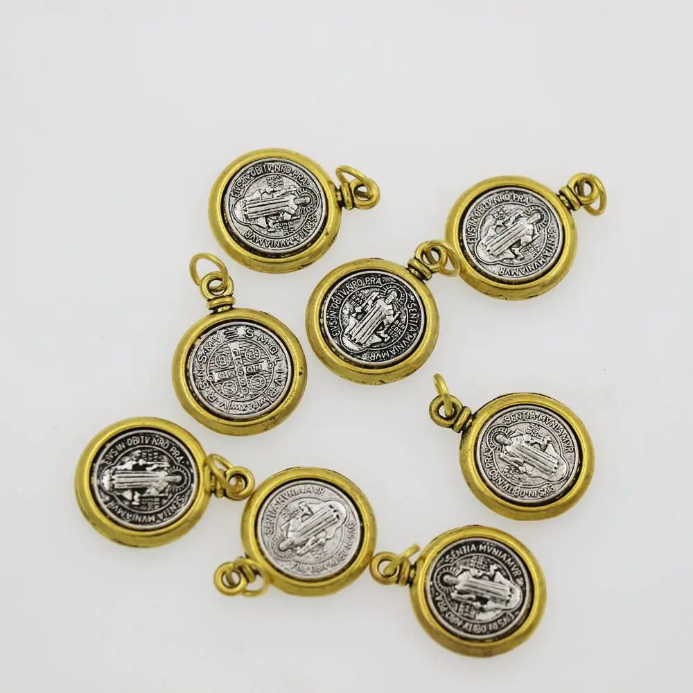 2-Tone Saint Benedict Medal Charme Beads, Pingentes Espaçador Cruz, Jóias Artesanais, DIY, 24.7×18.9mm, T1693, 6Pcs