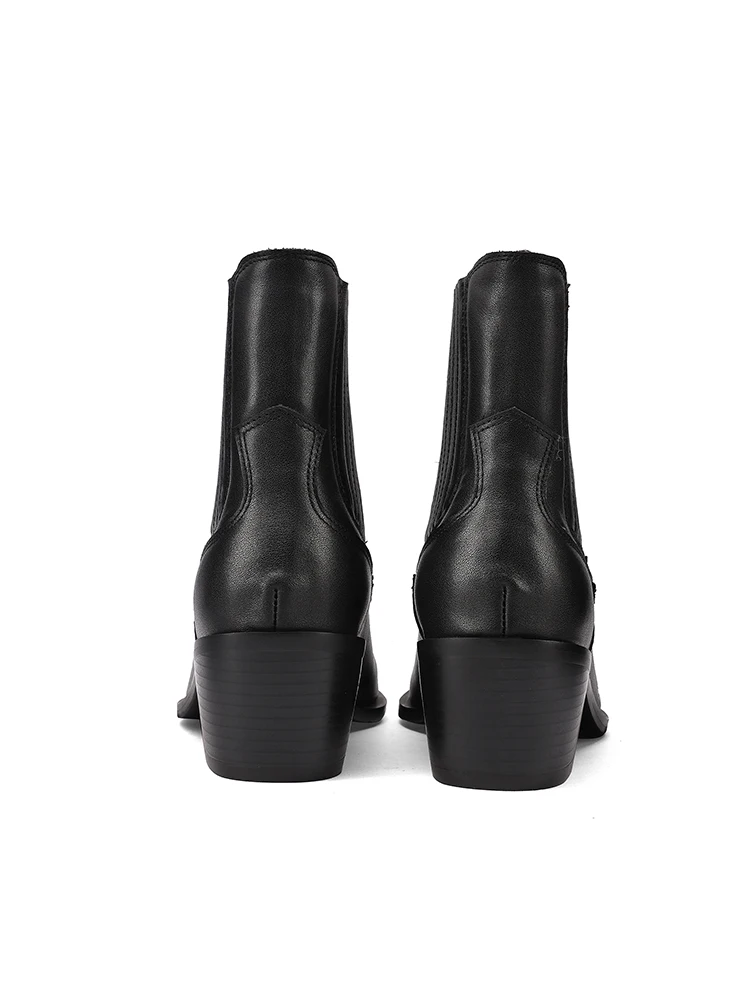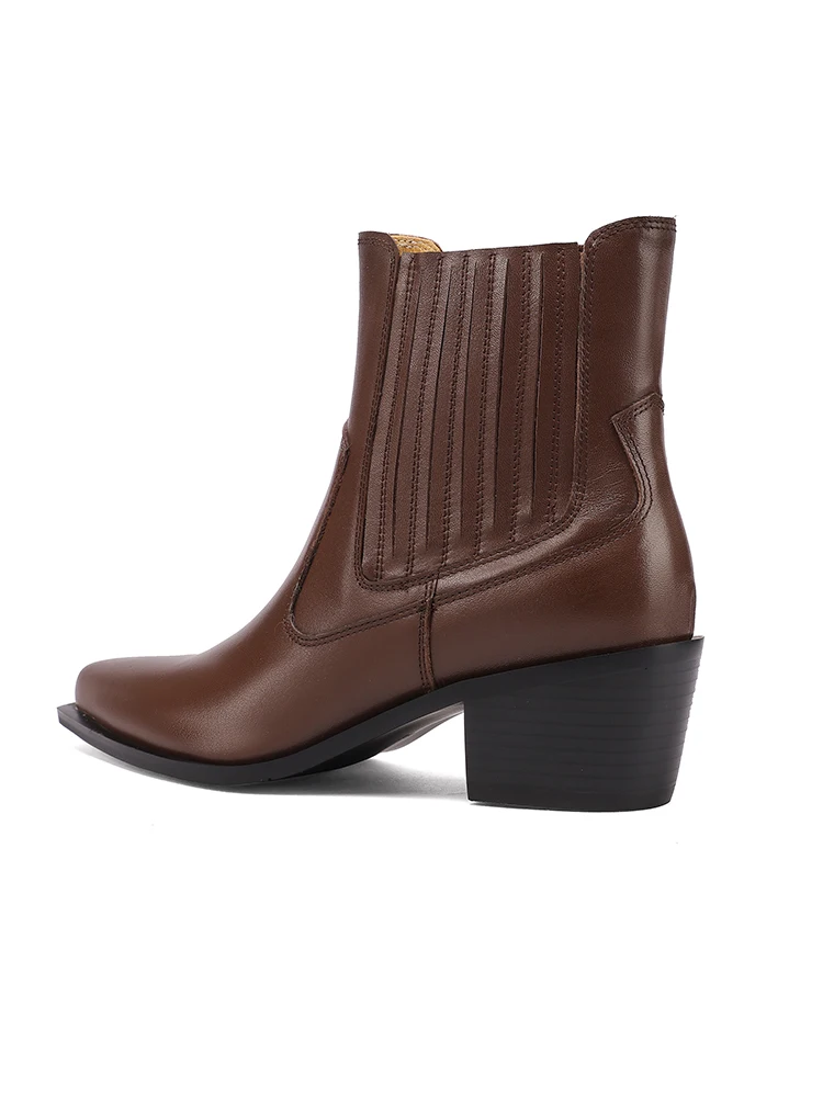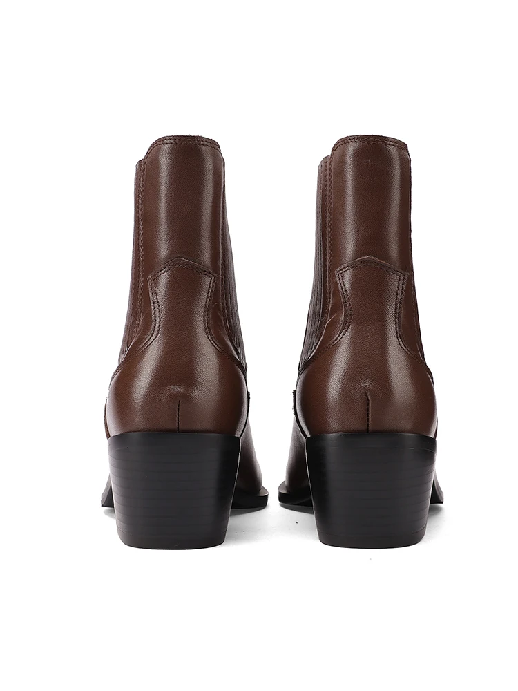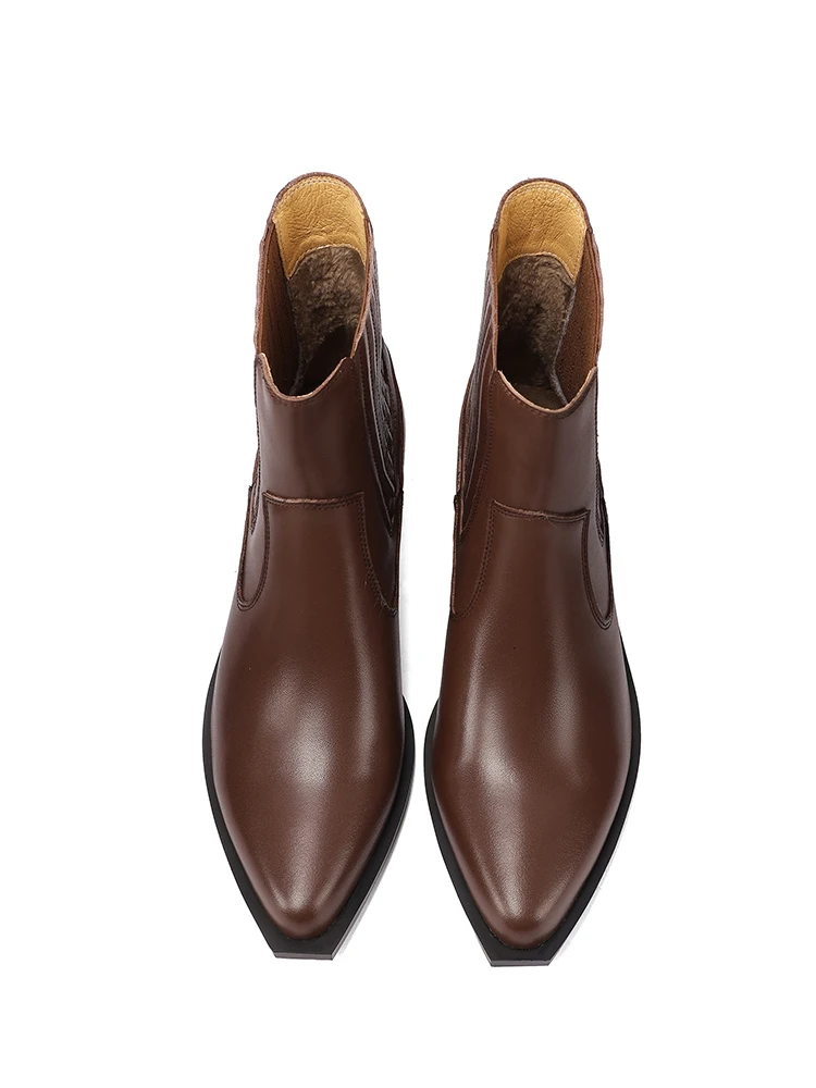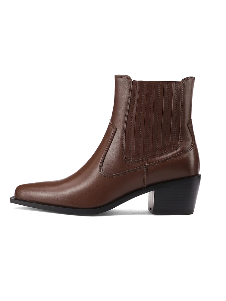 2025 nova tendência de couro de vaca genuíno botas de tornozelo feminino preto marrom bloco saltos preto apontou toe moda chelsea botas plus size