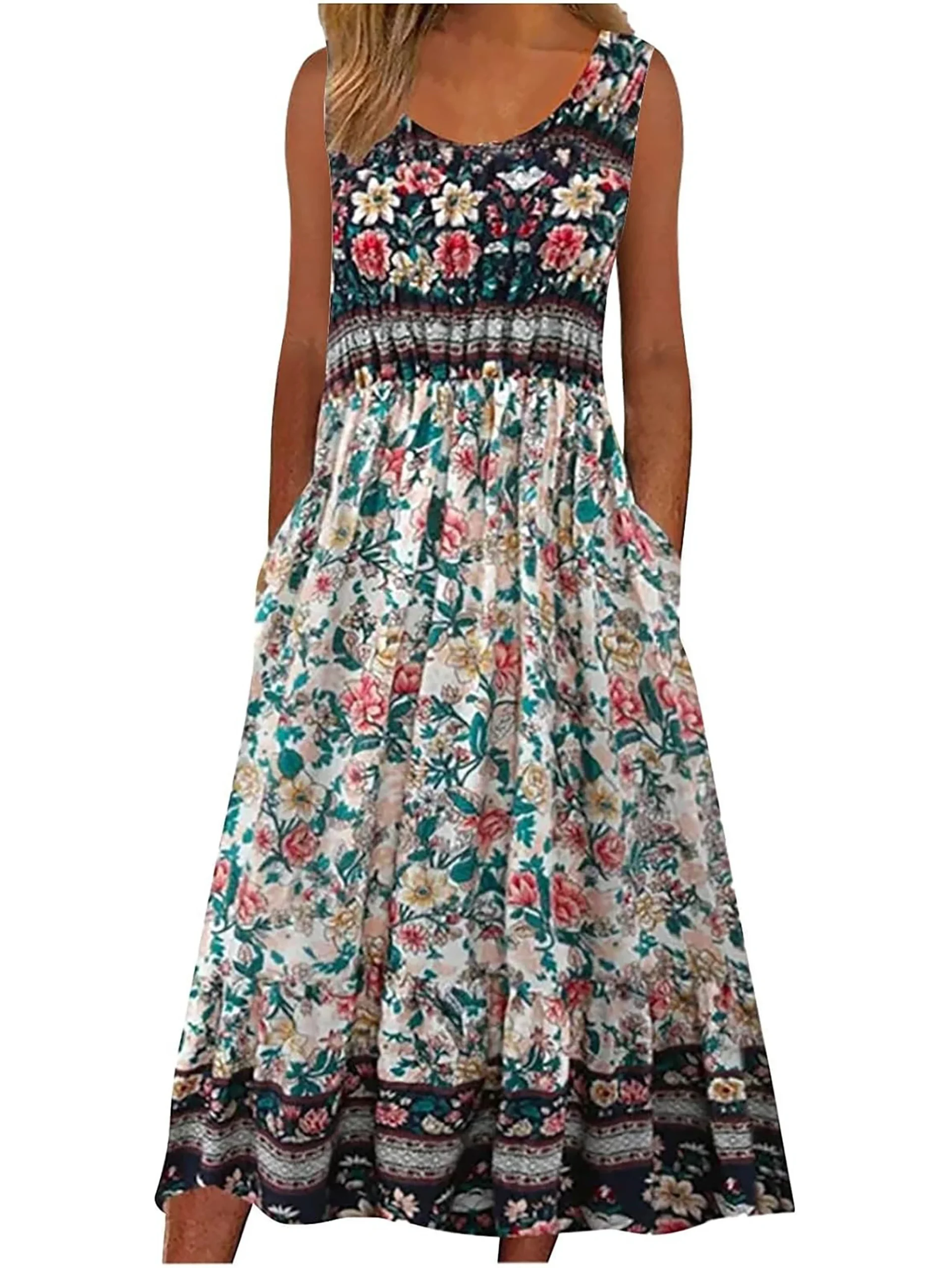 2025 verão novo! Vestido de verão feminino sem mangas boêmio floral casual praia MIDI com bolsos fluindo e solto