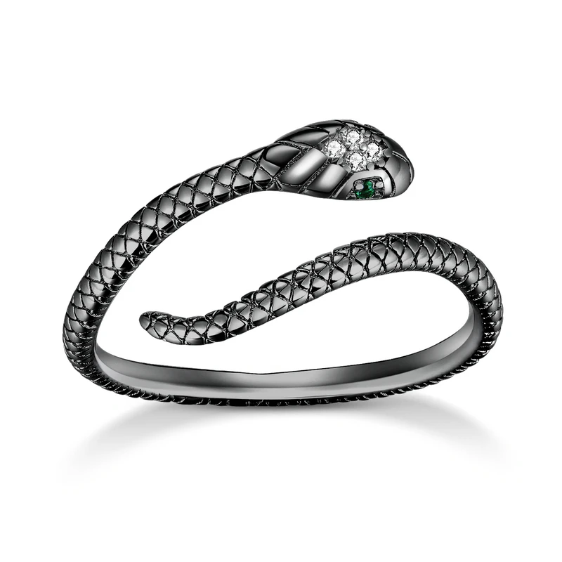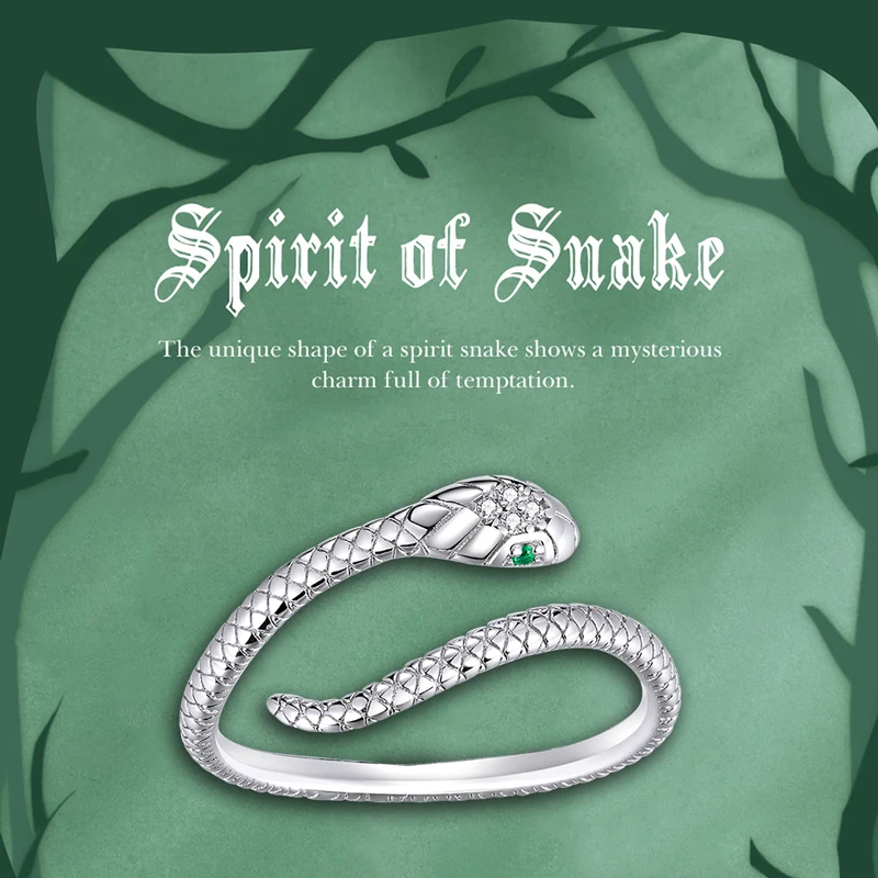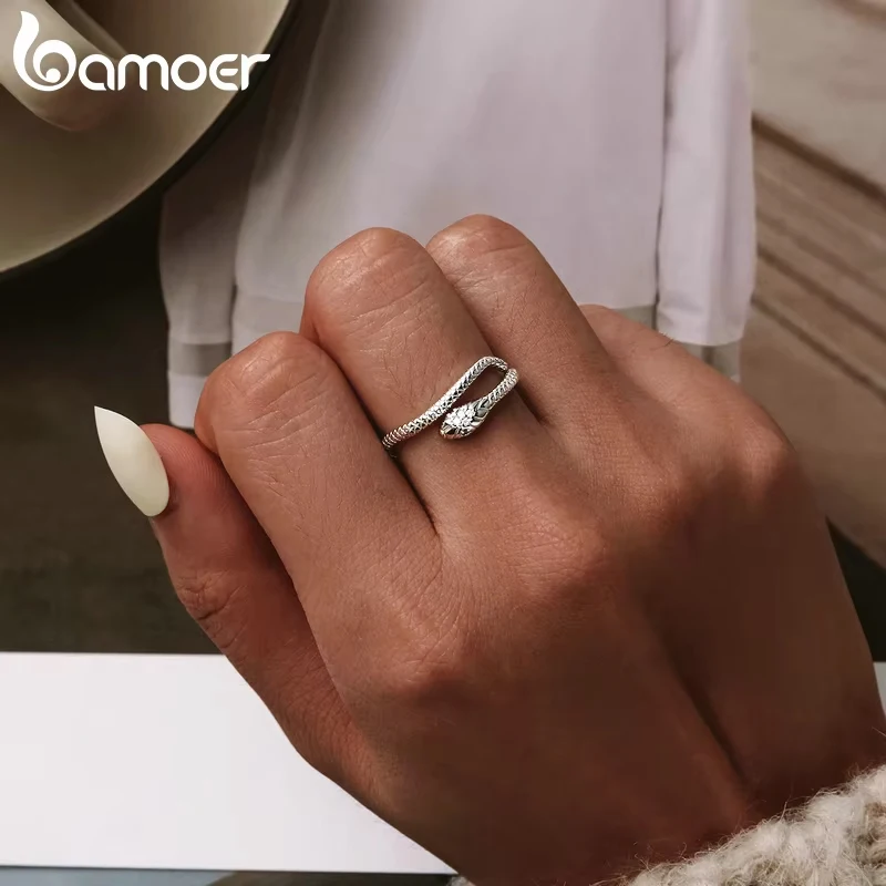 Bamoer 925 prata esterlina banhado a platina anel ajustável, zircão verde retro texturas cobra anel moda jóias 4 cores