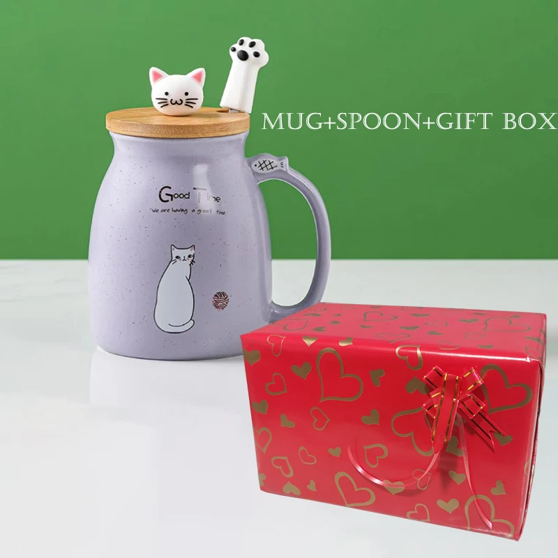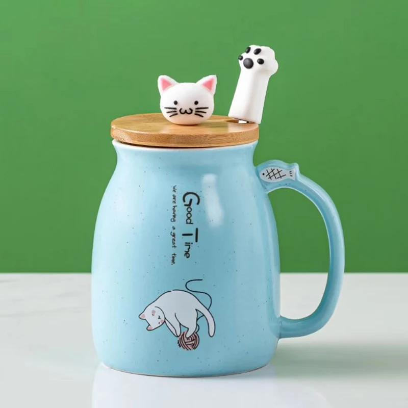 Caneca resistente ao calor de gato de cor criativa dos desenhos animados com tampa 450ml copo gatinho café canecas de cerâmica crianças copo escritório drinkware presente