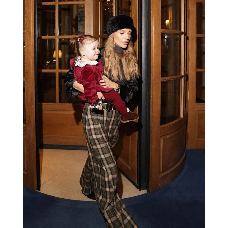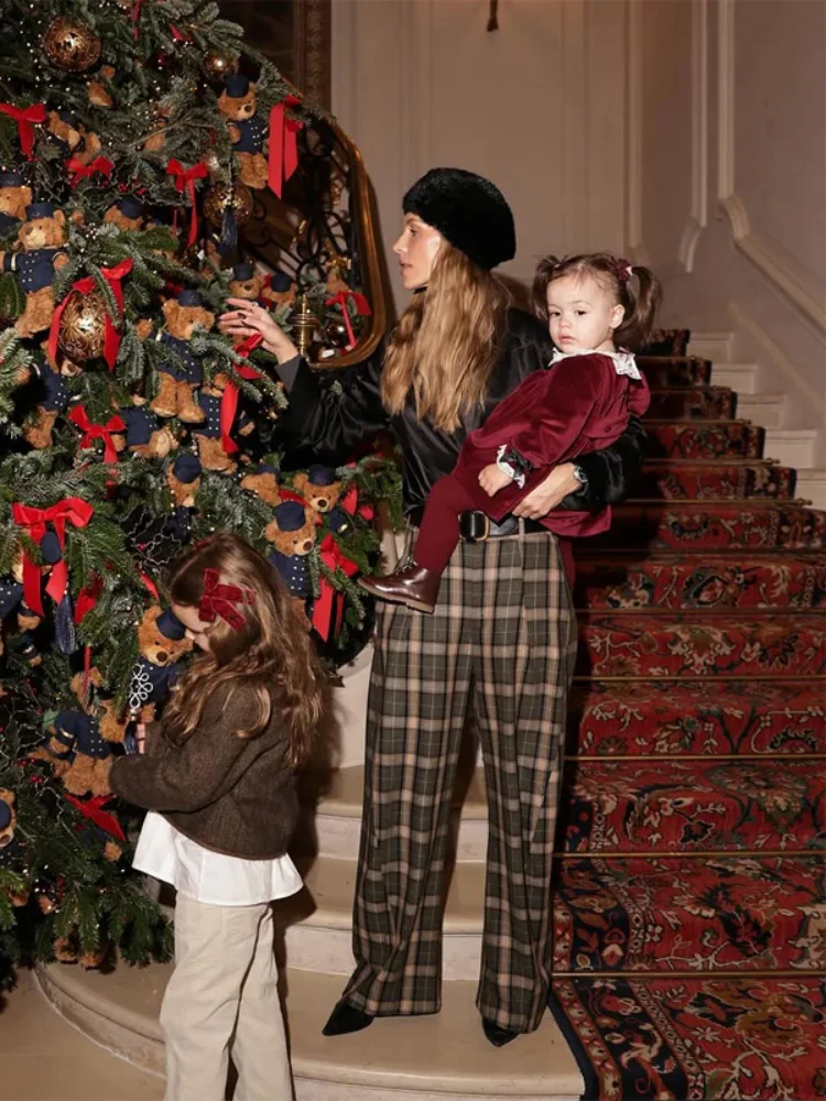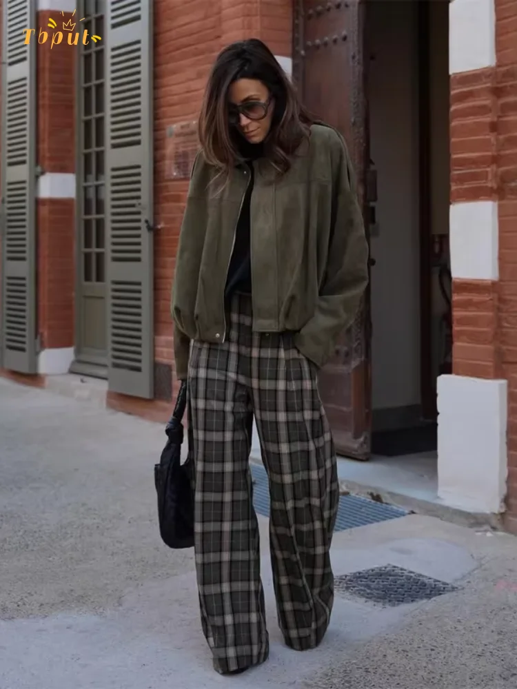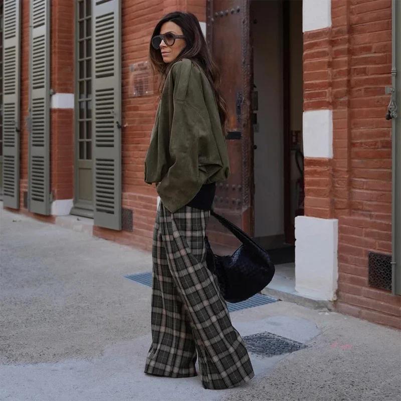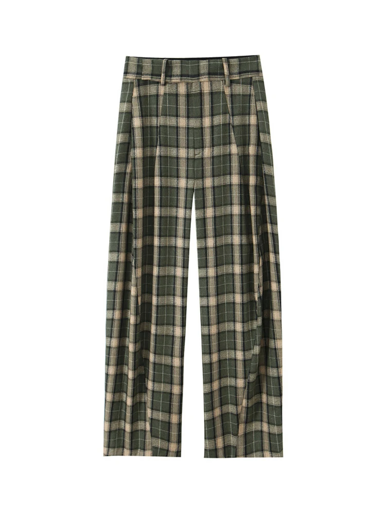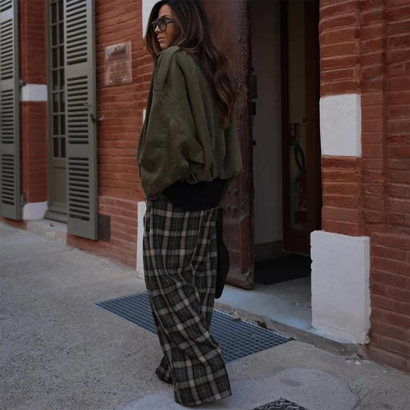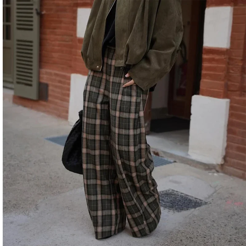 Chique verde xadrez impressão calças soltas feminino casual cintura alta em linha reta perna larga festa diária traje clássico 2026 primavera