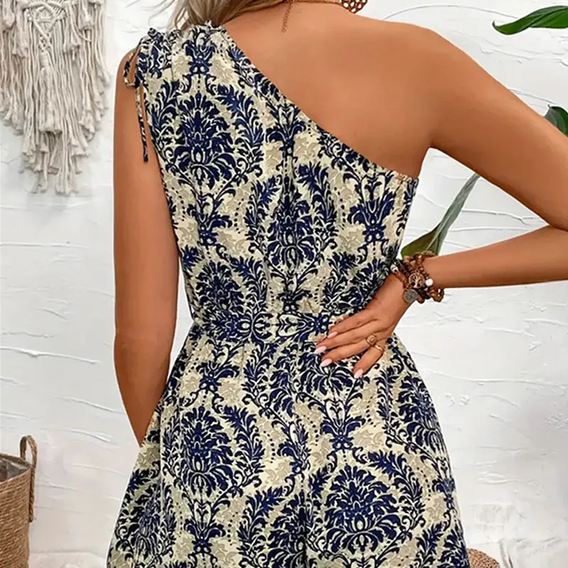 Macacão feminino com decote em v, manga curta, estampa de planta, boêmio, verão, casual, confortável, uso diário para festas de piquenique, passeios