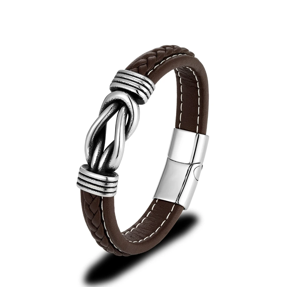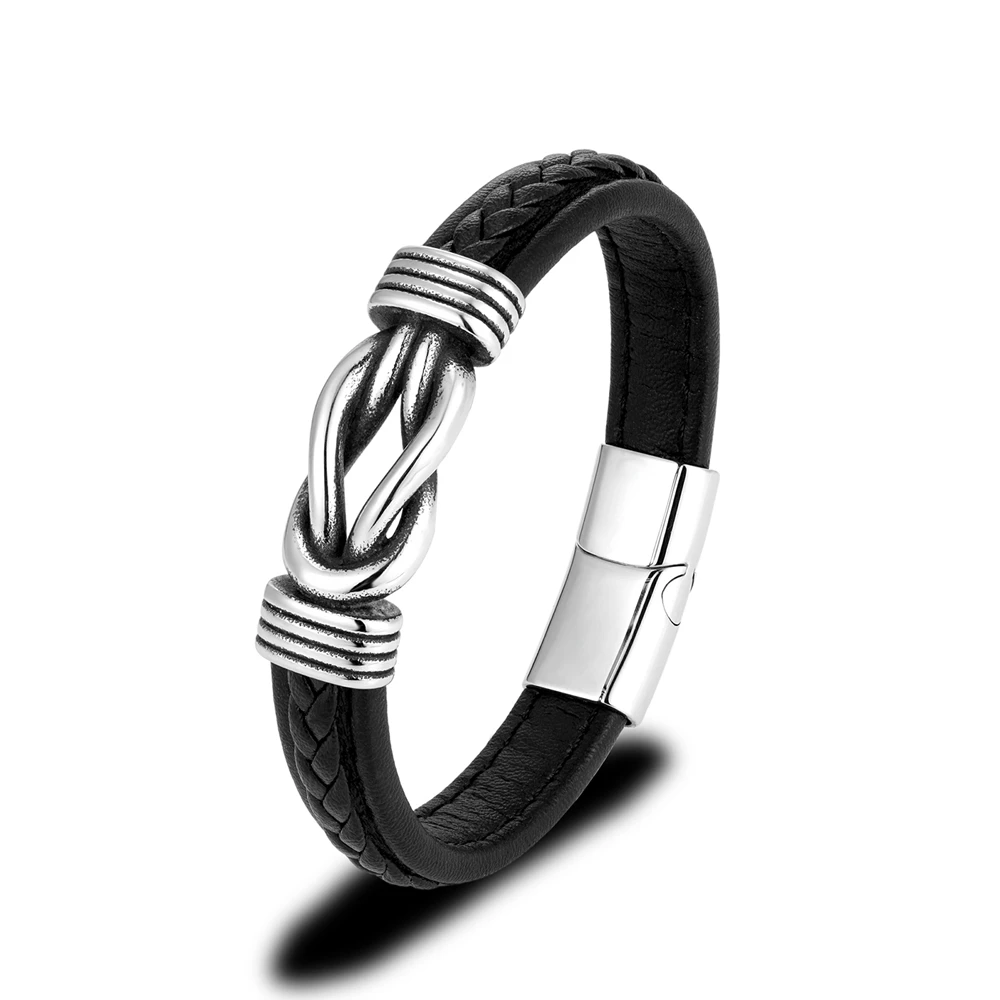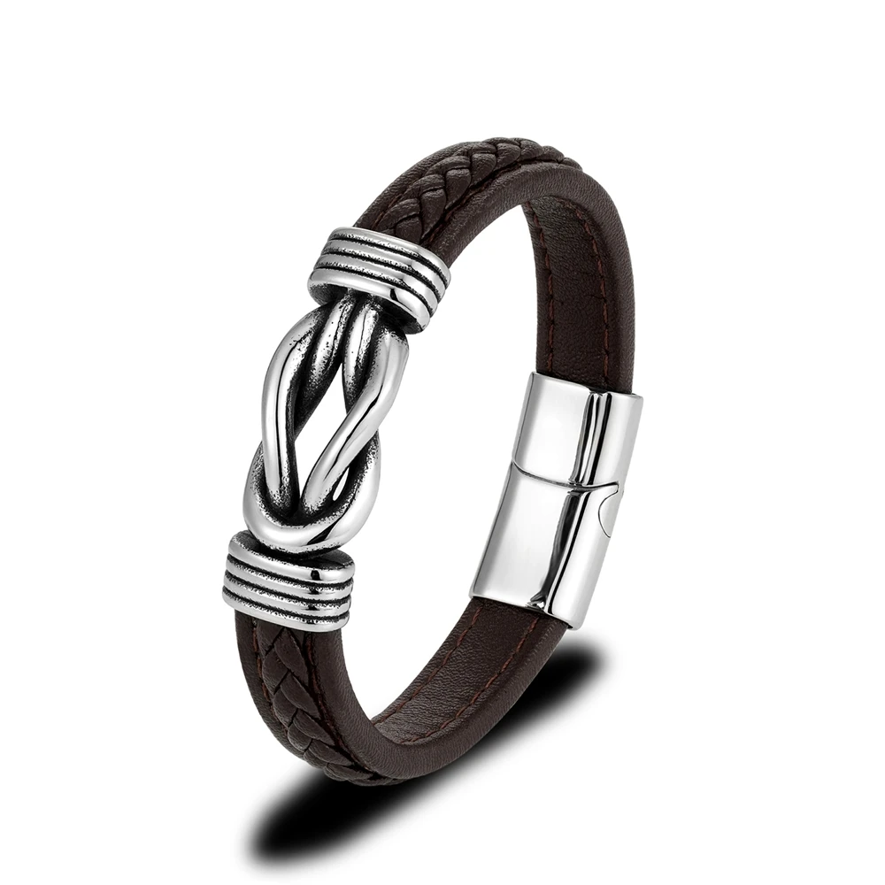 Mkendn punk retro masculino quadrado nó pulseira de couro para mulher de aço inoxidável ímã fivela infinito casal jóias