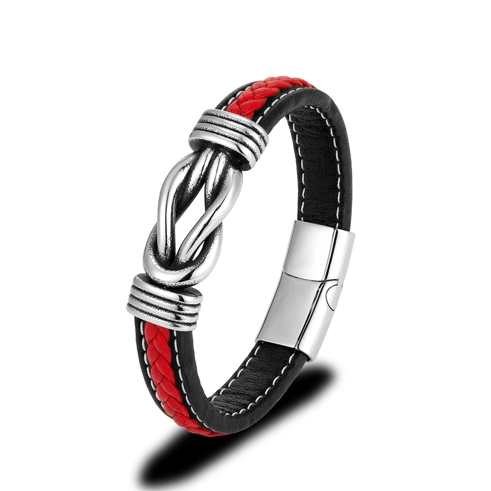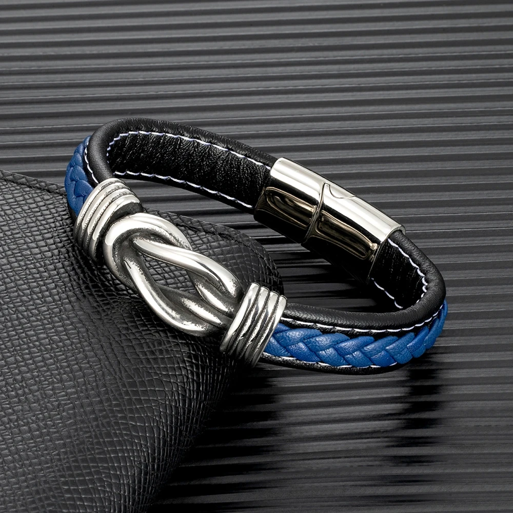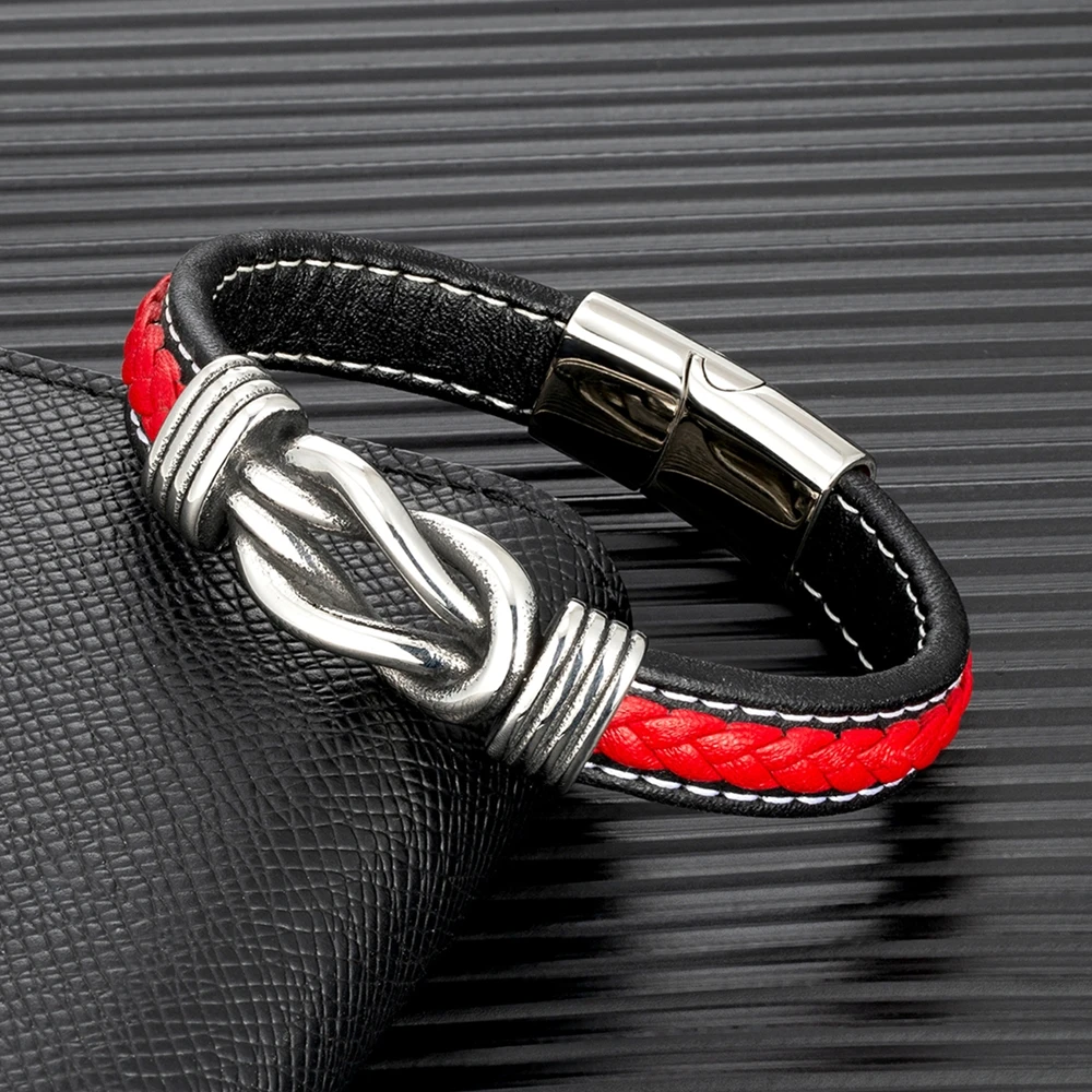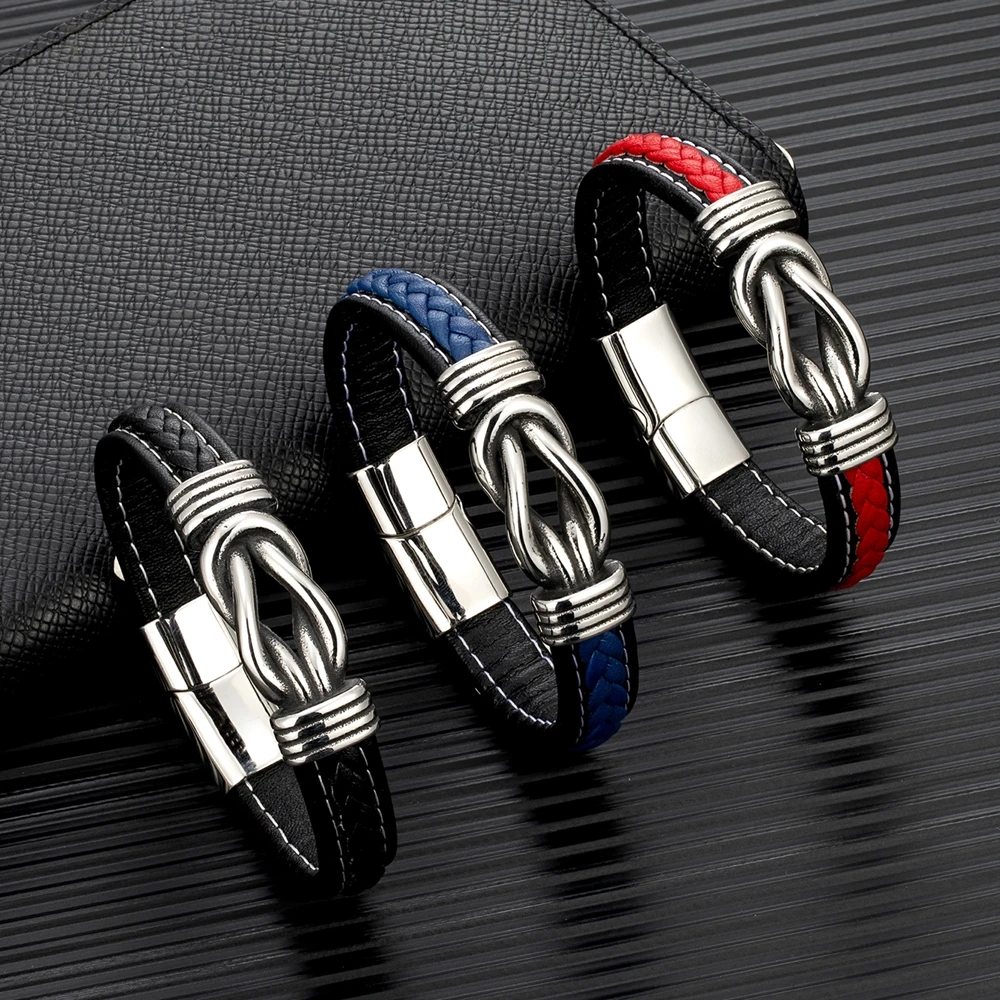 Mkendn punk retro masculino quadrado nó pulseira de couro para mulher de aço inoxidável ímã fivela infinito casal jóias