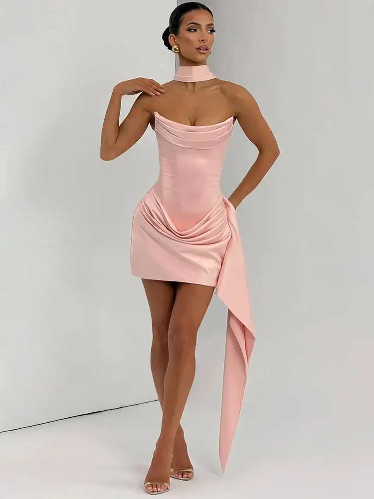 Mozision fora do ombro sem alças sexy mini vestido feminino elegante sem mangas sem costas cintura alta drapeado ruched clube vestidos de festa