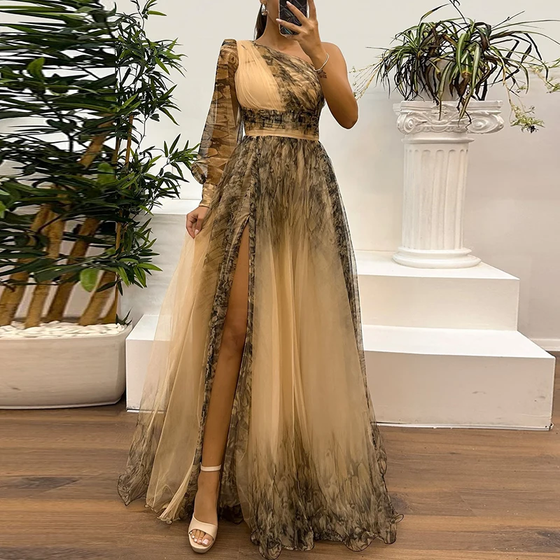 Padrão vintage impresso cintura alta vestido longo sexy assimétrico malha vestido de noite novo um ombro manga plissados vestido de dama de honra