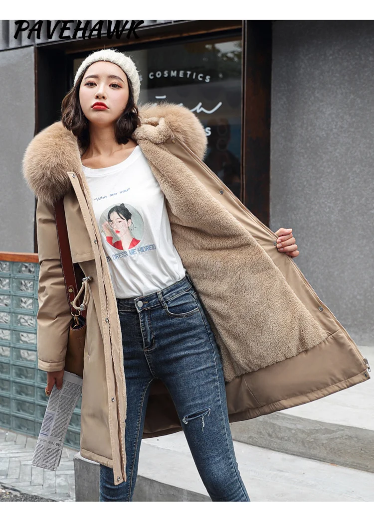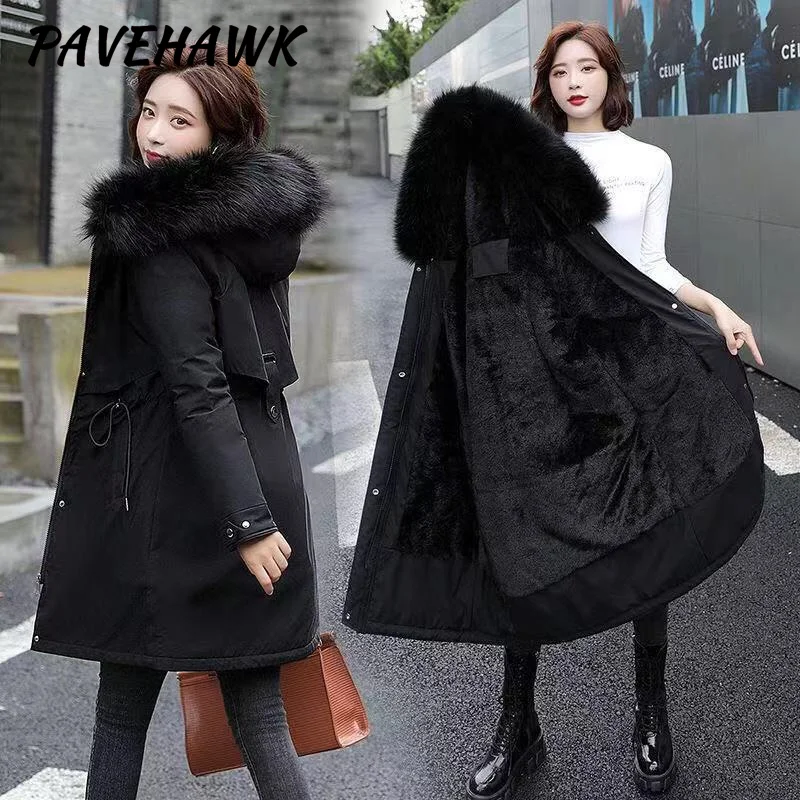 Parka de manga comprida feminina com zíper, gola de pele, cordão velo, casaco quente, streetwear casual, outwear grosso, inverno