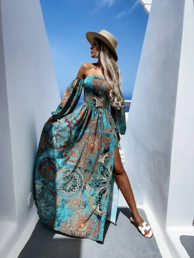 Primavera e outono uma linha pescoço fora do ombro manga longa sutiã divisão impresso high street sexy vestido longo robe feminino