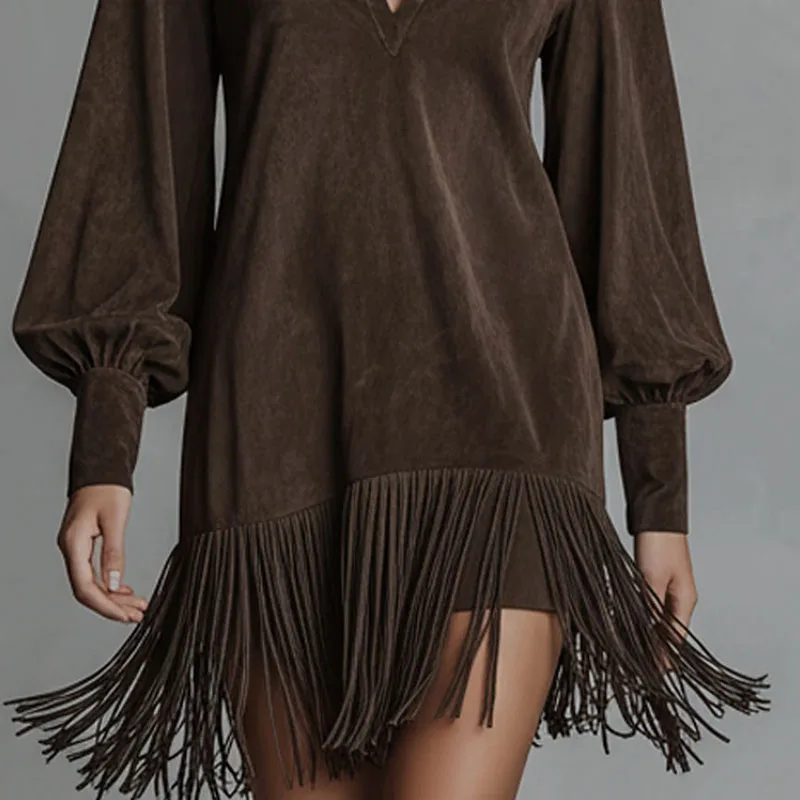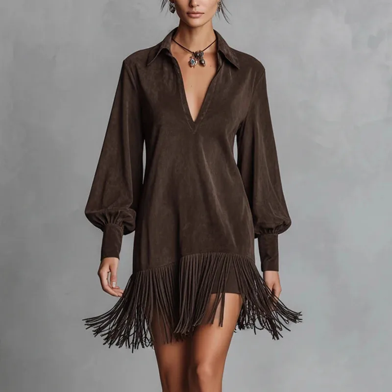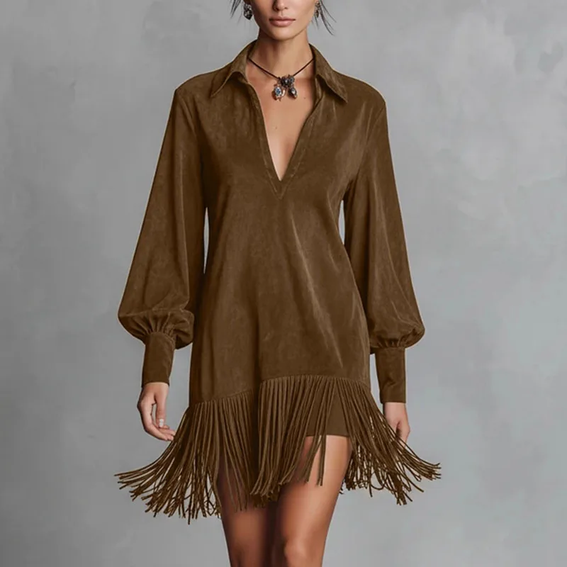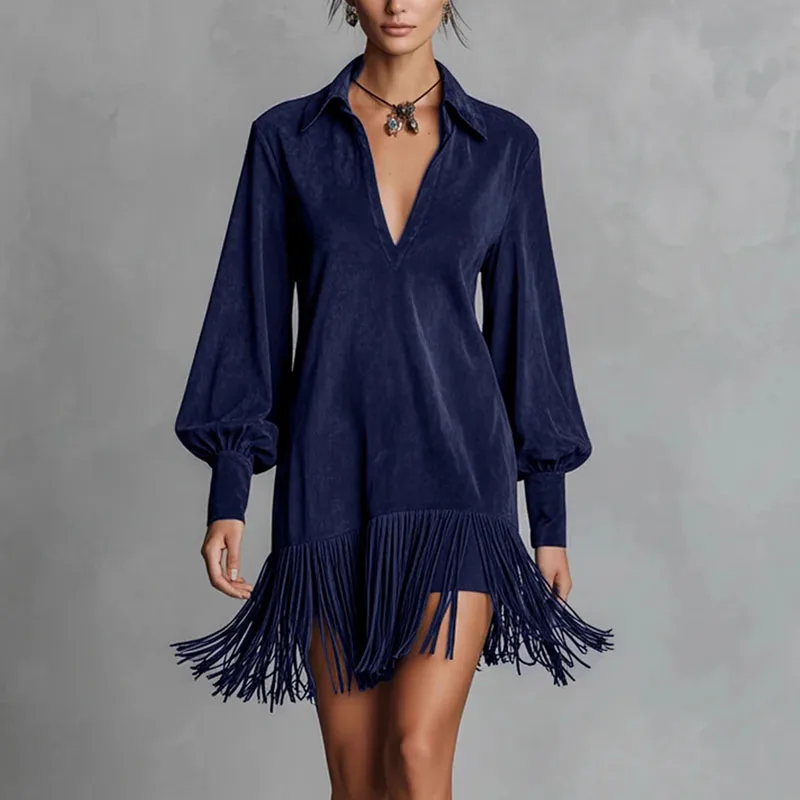 Primavera retro sólido imitação de camurça borla vestido mulher sexy lapela oco a linha mini vestido outono manga longa elegante vestido de festa