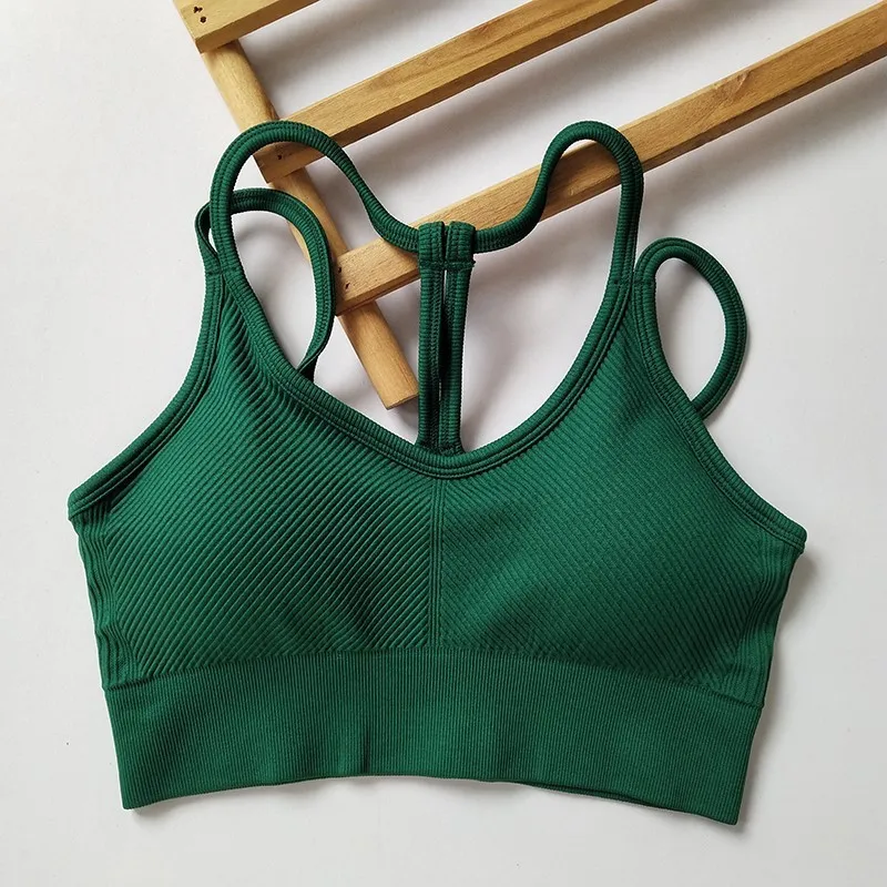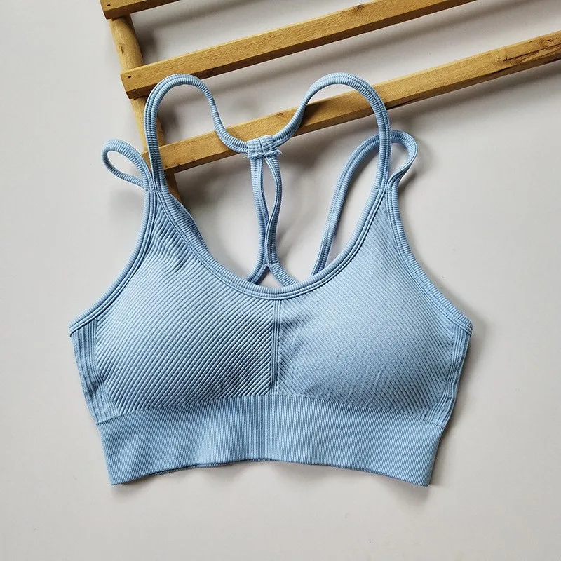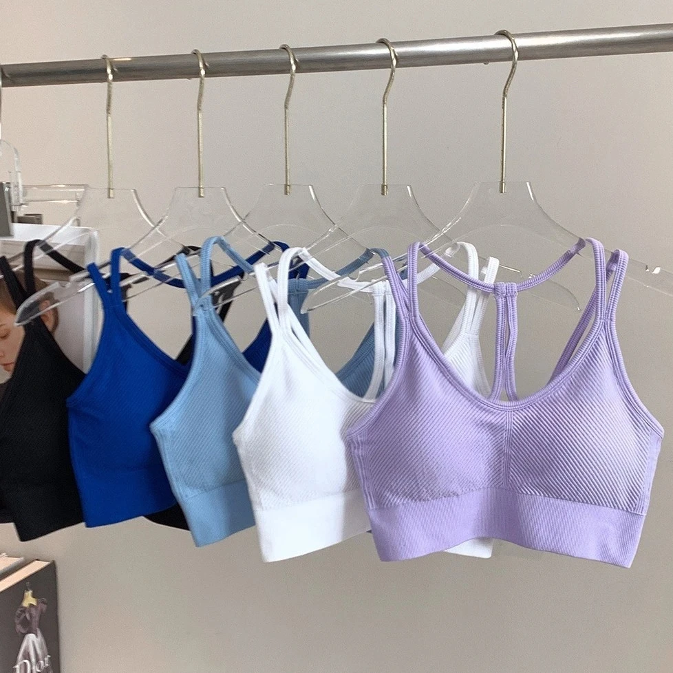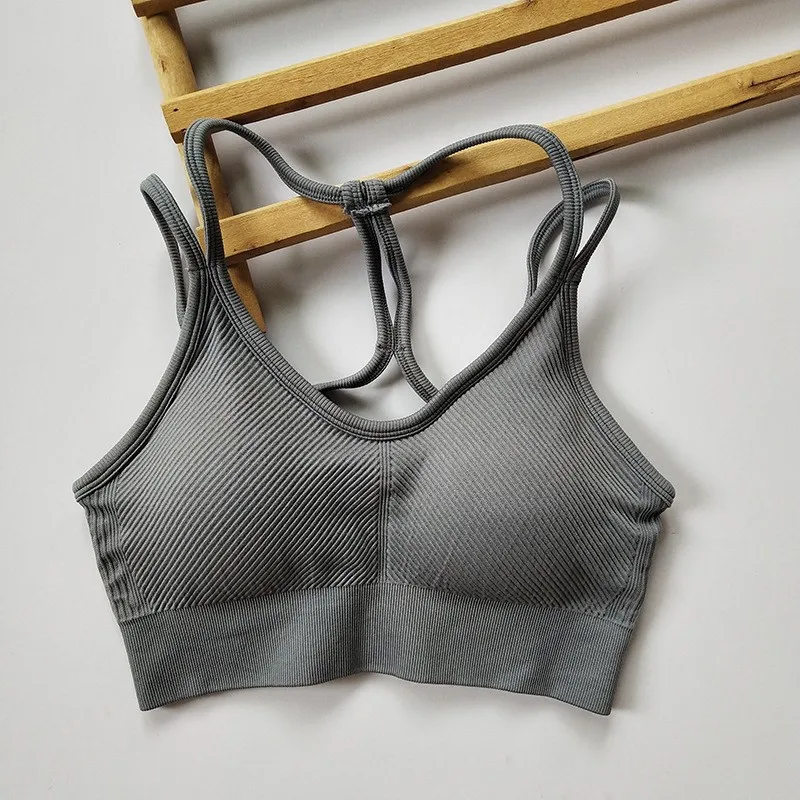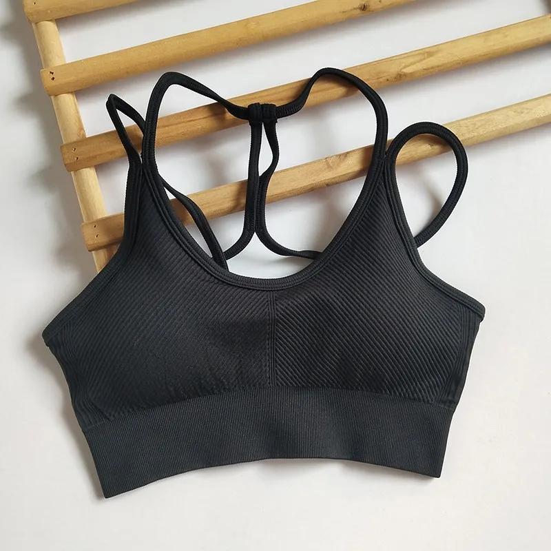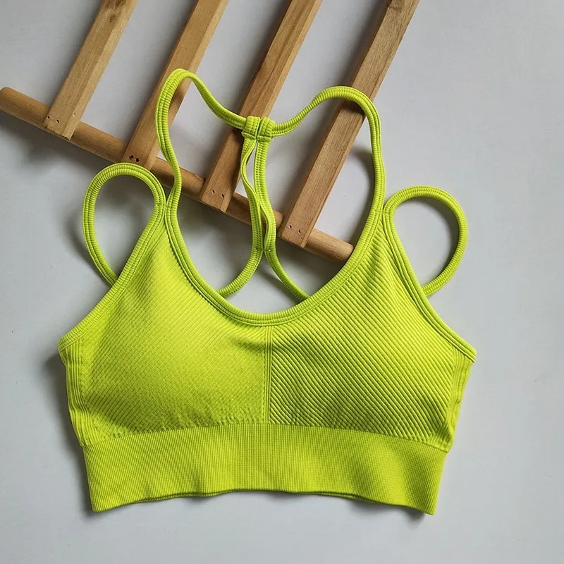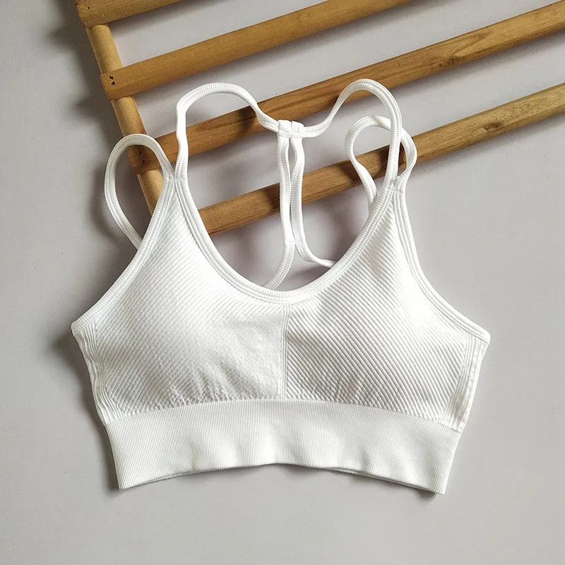 Regata feminina sem costura elástica sem costas com alça espaguete esportiva – com almofadas de sutiã para ioga e fitness