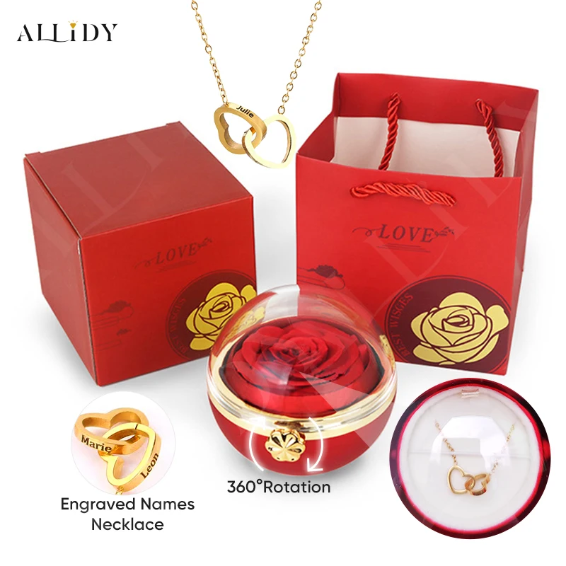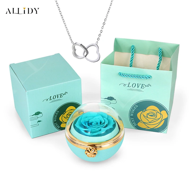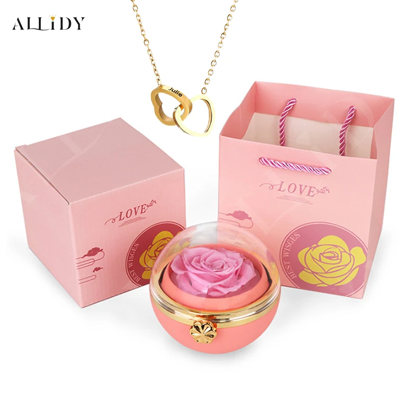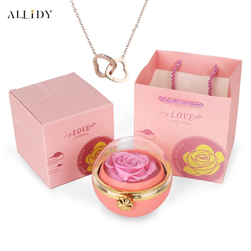 Rosa eterna redonda caixa de jóias personalizado nome gravado colar coração pingente feminino dia dos namorados presente de natal