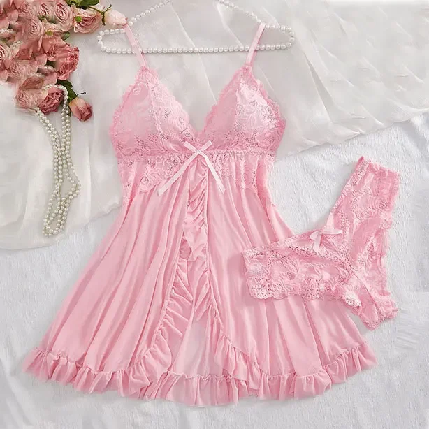 Suspensórios de tule azul renda decote em v camisola para mulheres lingerie roupa interior transparente mini vestido tanga conjunto camisolas