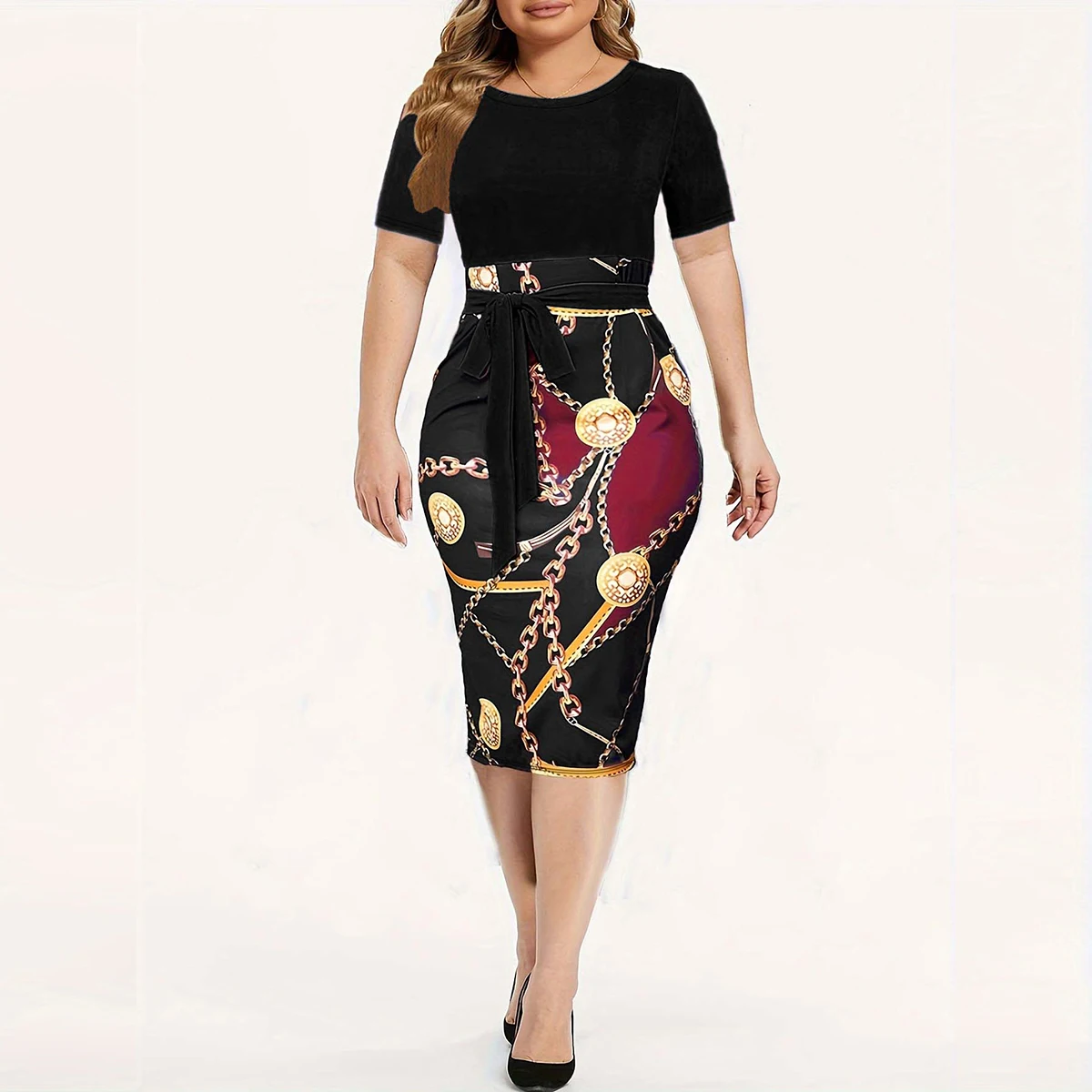 Vestido envolvente de viajante, feminino colorblock corrente impressão manga curta em torno do pescoço leve estiramento fino ajuste mini vestido com cinto