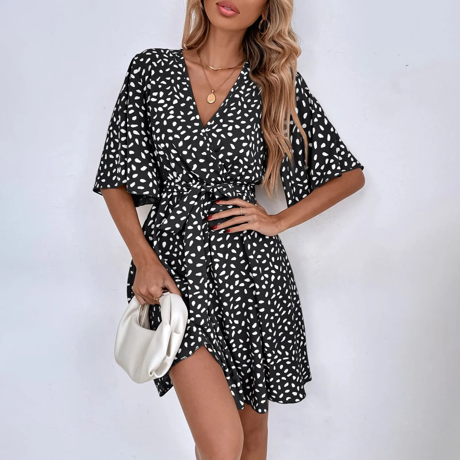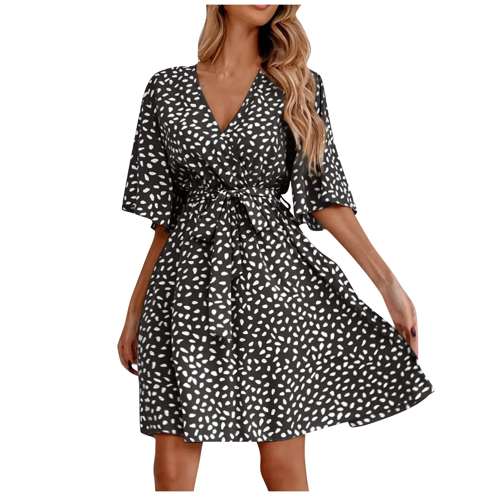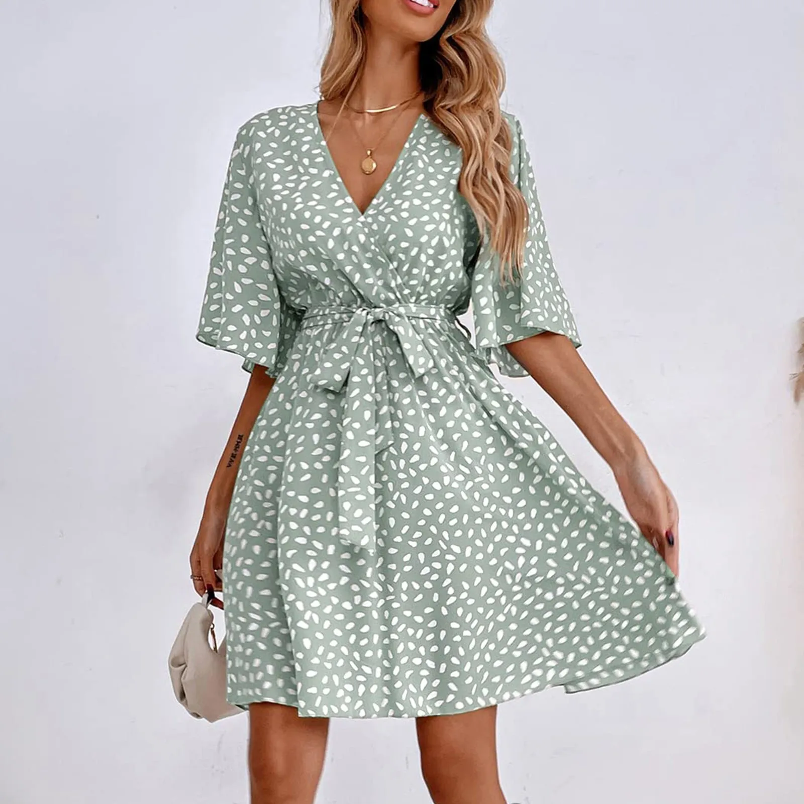 Vestido feminino cáqui de bolinhas com decote em v gravata cintura vestido elegante saia deslocamento lazer fresco uso diário confortável data