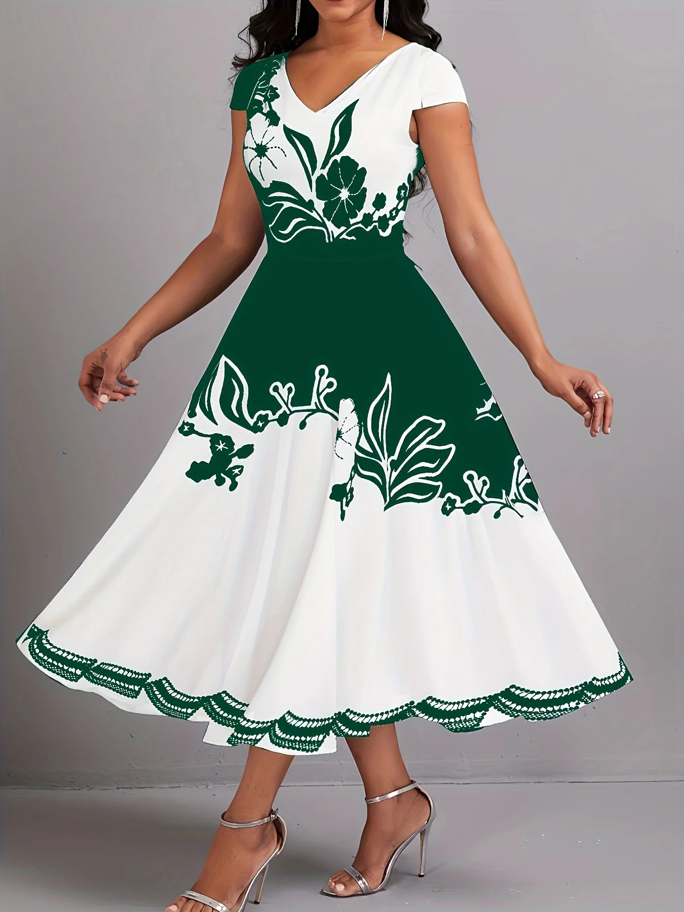 Vestido plus size com estampa floral peplum – decote em V elegante, mangas curtas, bainha recortada, elástico médio, fecho com zíper, lavagem à máquina