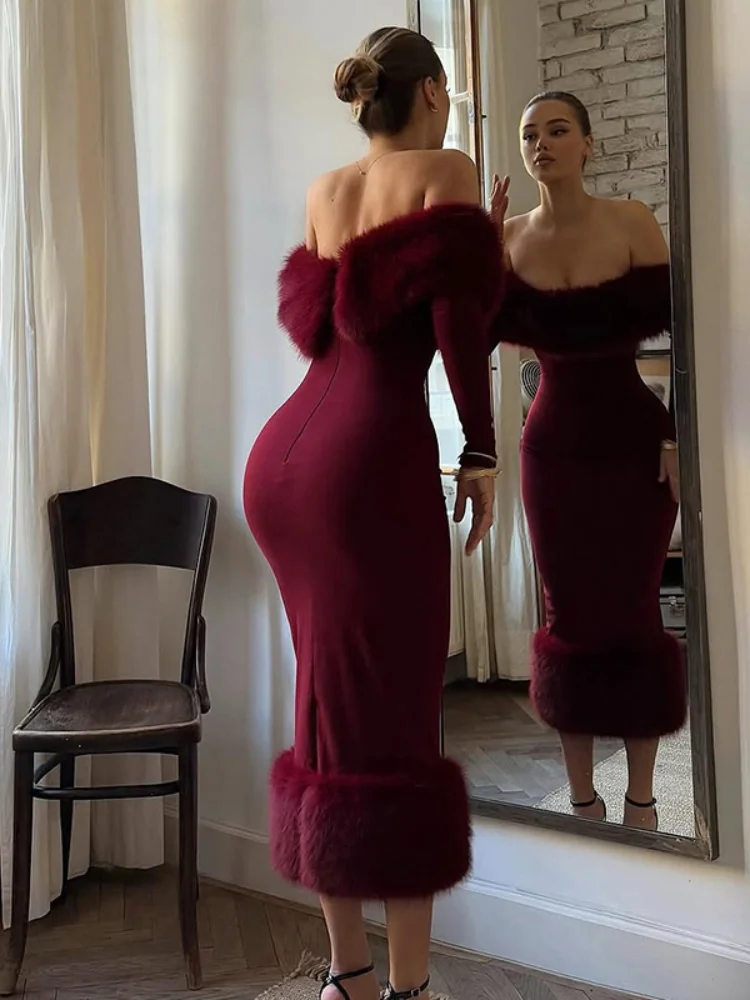 Feature3: Solid Faux Fur Patchwork Strapless Maxi Dress Women Elegant Full Sleev