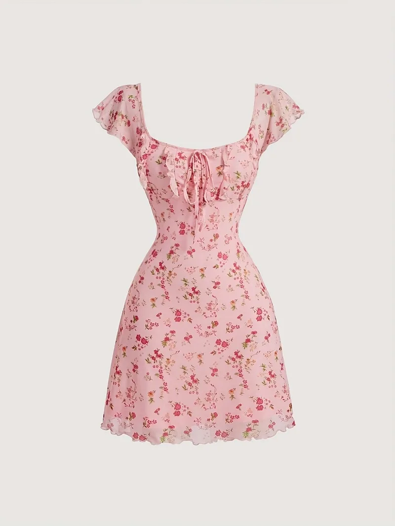 Vestidos femininos sem mangas babados guarnição gola quadrada tie-up corte sem costas floral/pontos festa de verão curto mini vestido evasê