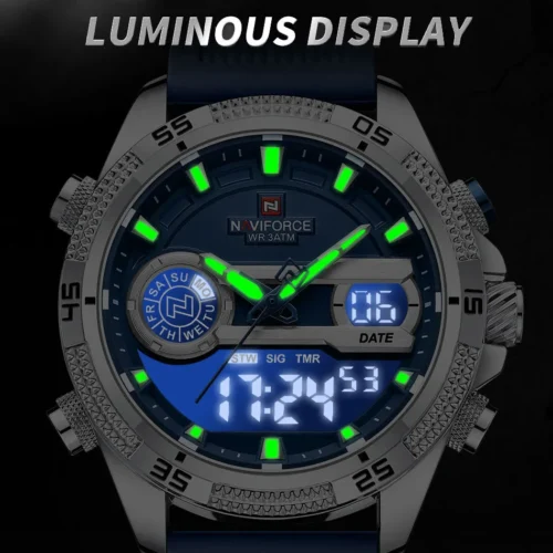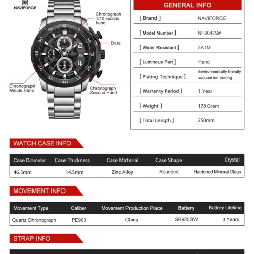 SPECIFICATIONS Band Length: 25 Band Material Type: Stainless Steel Battery Included: Yes Boxes & Cases Material: Paper Brand Name: NAVIFORCE Case Material: Alloy Case Shape: Round Case Thickness: 14.5 Certification: CE Choice: yes Clasp Type: Bracelet Clasp Dial Window Material Type: Hardlex Display Type: Numberless Feature: Stop Watch,Back Light,Shock Resistant,Luminous,Complete Calendar,Water-Resistance High-concerned chemical: None Item…